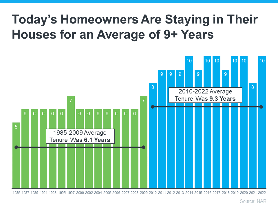 From 1985 to 2009, the average length of time homeowners stayed in their homes was roughly six years. But according to the National Association of Realtors (NAR), that number is higher today. Since 2010, the average home tenure is just over nine years (see graph below):