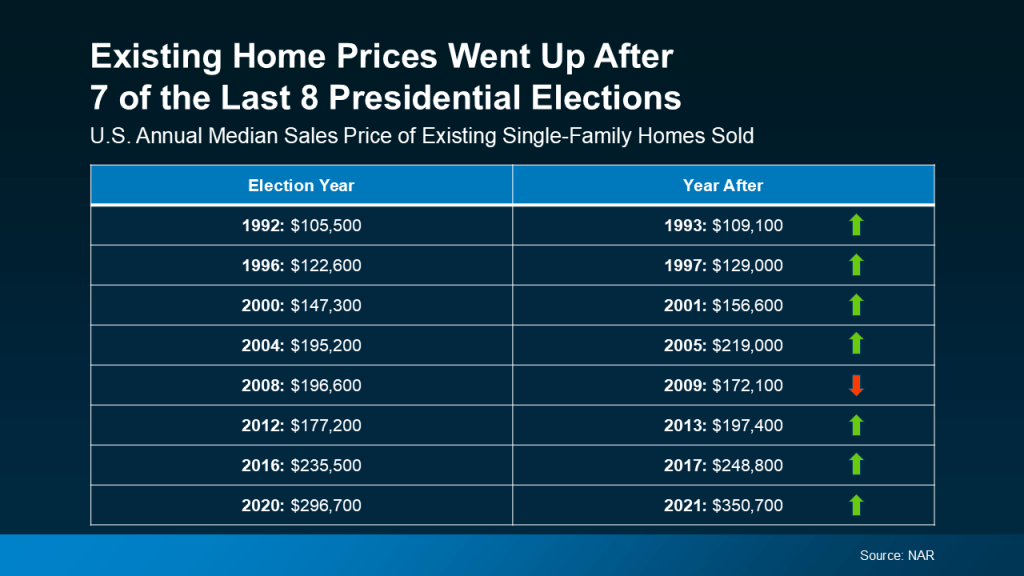 There’s usually a slight dip in home sales in the month leading up to the election – think October and November. Why? Some people prefer to wait it out before making any big decisions. But the good news is this slowdown is temporary. Historically, home sales bounce back and even rise the following year.