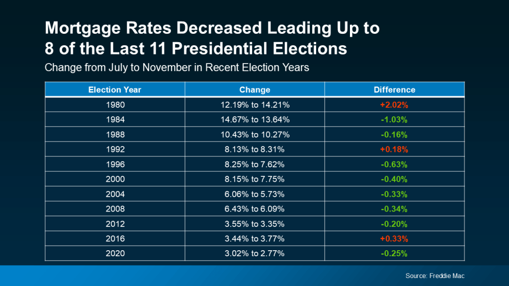 Mortgage rates are another big factor to keep in mind. Looking at the past 11 Presidential elections, mortgage rates dropped from July to November in 8 of those years. And guess what? We’re already seeing that happen in 2024, with many experts predicting rates will continue to dip slightly through the rest of the year. Lower rates mean more purchasing power if you’re planning to buy soon.