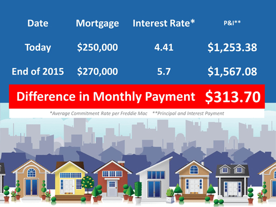 Let us explain. Recently, we reported that a nationwide panel of over one hundred economists, real estate experts and investment & market strategists projected that home values would appreciate by approximately 8% from now to the end of 2015. Additionally, Freddie Mac’s most recent Economic Commentary & Projections Table predicts that the 30 year fixed mortgage rate will be 5.7% by the end of next year.