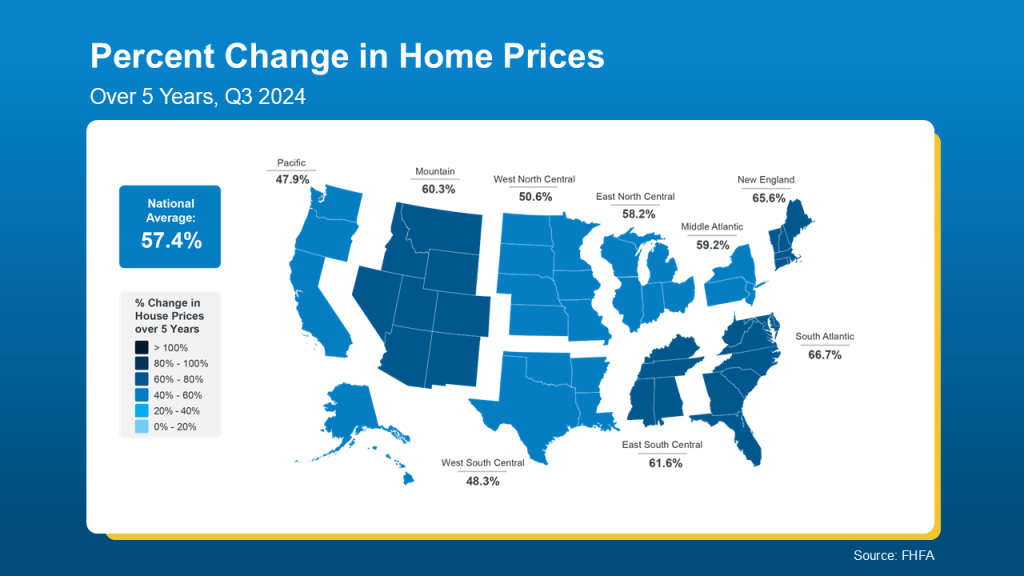 The map below shows how home prices have grown over the past five years, based on data from the Federal Housing Finance Agency (FHFA). Since prices vary by location, the map breaks things down region by region to give you a better idea of the overall market trends:
